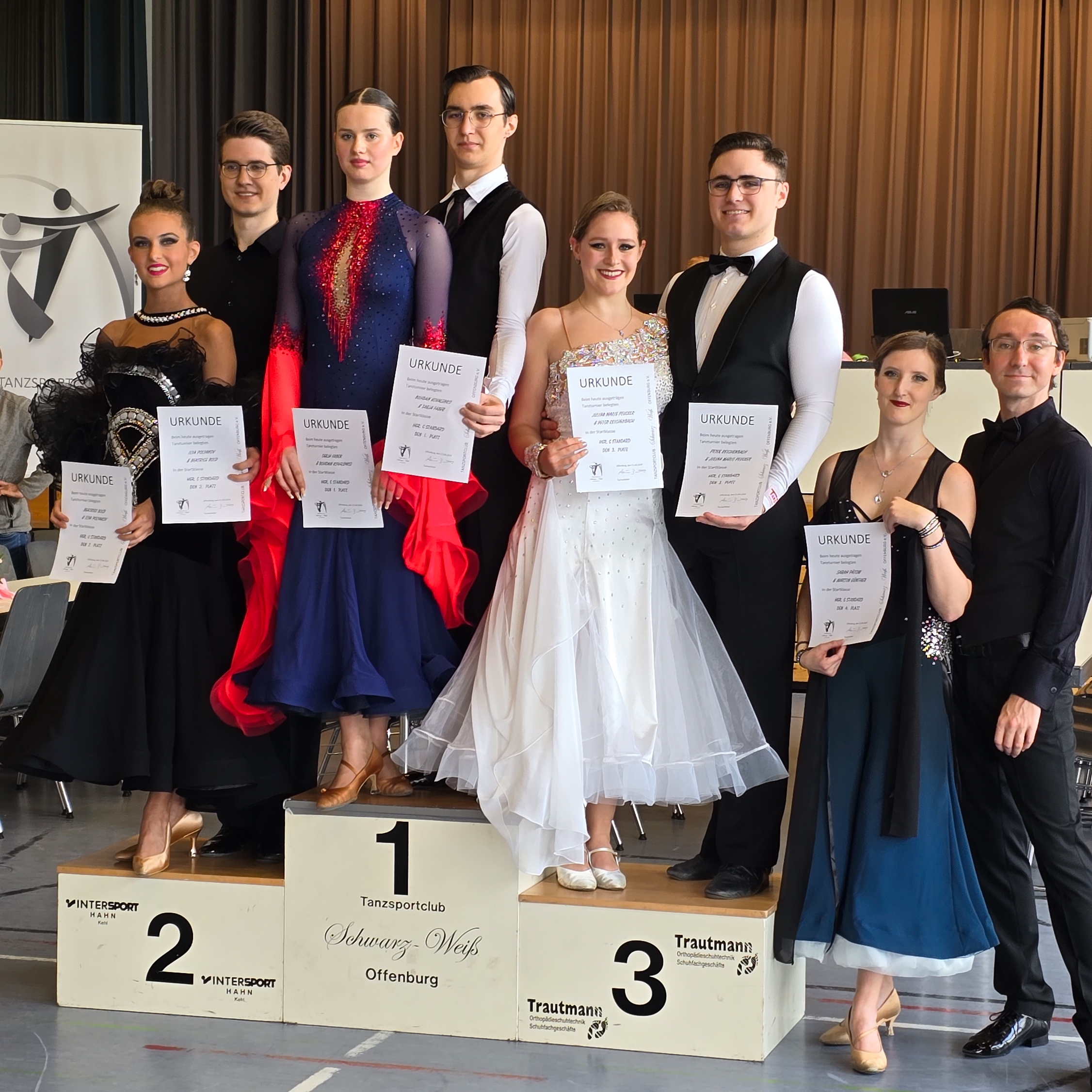Die Tanzpaare Marius Wrobel / Vanessa Trittmacher und Bohdan Kovalenko / Tarja Faber haben dieses Jahr bei den Baden-Württembergischen Meisterschaften einen bemerkenswerten Tanzerfolg erzielt. Ihre Leistungen wurden nun von der Stadt Offenburg gewürdigt und im Rahmen der Sportlerehrung 2023 geehrt. Wir gratulieren den beiden Tanzpaaren herzlich zu ihrem Erfolg und wünschen ihnen weiterhin viel Freude auf ihrem tänzerischen Weg.